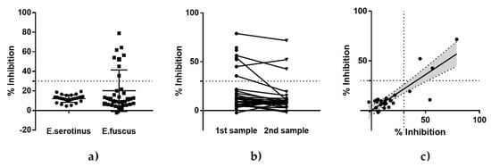 ELISA results (% inhibition) for sera from Eptesicus serotinus and Eptesicus fuscus taken prior to experimental studies. The threshold of 30% inhibition as a cut-off for seropositivity is indicated as a dashed line. (a) ELISA results for all sera tested stratified by species. For Eptesicus fuscus, serum was taken at two occasions prior to infection. The comparative results between sampling point one and two are presented on an individual level (b) and were analyzed by a linear regression model (c). The slope (solid line) and the 95% CI (gray zone) are indicated. The results for the second sampling can be calculated using the formula Y = 0.7205X + 0.07097, with a slope that is highly significant divergent from zero (p < 0,0001).
