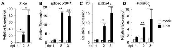 ZIKV infection activates IRE1α and induction of XBP1 targets. Cells were infected with ZIKV and RNA was harvested at the indicated number of days post infection (dpi). The relative mRNA abundance of ZIKV RNA (A) spliced XBP1 (B), ERDJ4 (C), and P58IPK (D) were determined by quantitative RT-PCR. Data are means ± SD of four replicates and are representative of at least two independent experiments. * p < 0.05, ** p < 0.001, by unpaired t test.