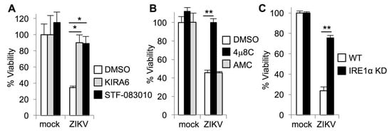 3.3. IRE1α and XBP1 Promote Zika Virus Replication in Cultured Cells