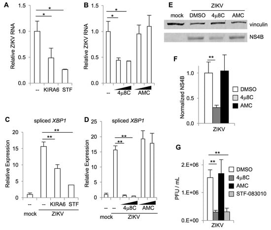 In addition to reduction in viral RNA, we found that the IRE1α nuclease inhibitor 4μ8C, but not the negative control AMC, reduced viral NS4B protein in infected cells (Figure 3E,F) and the release of infectious virus detected by plaque assay (Figure 3G). We confirmed this result using the IRE1α nuclease inhibitor STF-083010, which also reduced viral titers in the cell culture medium (Figure 3G).