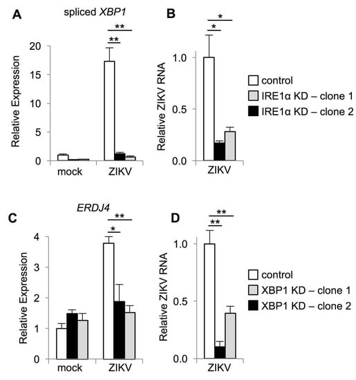The following are available online at https://www.mdpi.com/1999-4915/12/3/278/s1, Figure S1. ZIKV infection induces IRE1α phosphorylation and sXBP1 protein production, Figure S2. ER stress induced expression of ERDJ4 and P58IPK requires XBP1, Figure S3. IRE1α inhibitors limit ZIKV-induced ER reorganization, Figure S4. Efficiency of conditional genetic deletion, Figure S5. Model for the Role of IRE1α and XBP1 during ZIKV Infection.