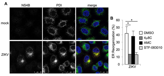 Spliced XBP1 is required and sufficient to cause ER expansion and remodeling in specialized secretory cells [42,43,44]. Flaviviruses, including ZIKV, induce ER expansion and redistribution, which creates membranous platforms for viral RNA replication and virion packaging [45,46]. To determine whether ER redistribution in ZIKV-infected cells requires IRE1α, we performed immunostaining for the ER marker, protein disulfide isomerase (PDI). Consistent with other studies [45,46,47], we found striking PDI redistribution in ZIKV-infected cells with perinuclear ER accumulation (Figure 5A). PDI redistribution was abolished by the IRE1α nuclease inhibitor 4μ8C, but not the structurally similar negative control, AMC (Figure 5B and Figure S3). The IRE1α nuclease STF-083010 similarly prevented PDI redistribution in ZIKV-infected cells (Figure 5B and Figure S3). Together, these results suggest that ER redistribution during ZIKV infection requires IRE1α nuclease activity.