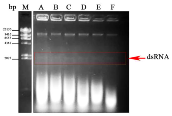 dsRNA-enriched extracts from different isolates of Fusarium oxysporum f. sp. dianthi. Agarose gel electrophoresis of the dsRNA extracts obtained by cellulose column chromatography from different isolates (A-F) of F. oxysporum f. sp. dianthi. M: molecular weight marker II (Roche Diagnostics, Rotkreuz, Switzerland).