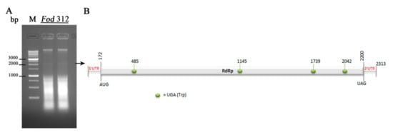 Due to their possible use as biological control agents [,,,,,,], and to the current low cost of mass sequencing techniques [,], the description of new mycoviruses, in general, and of new mitoviruses in particular, is increasing considerably in recent times. Mitoviruses have been found in many phytopathogenic fungi, including both ascomycetes and basidiomycetes [,,,,,,,,,], and also in many entomopathogenic fungi [,,]. Nevertheless, among the hundreds of mitoviruses described so far, none has been identified infecting a strain of the important phytopathogenic species F. oxysporum. Mitovirus FodMV1 has been detected in a strain of F. oxysporum f. sp. dianthi and, therefore, is the first mitovirus described infecting F. oxysporum.