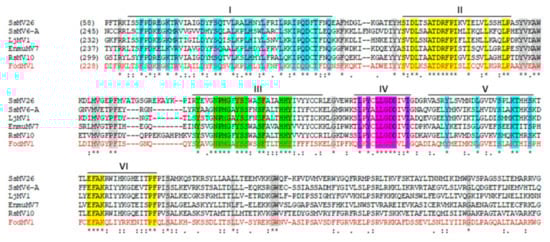 Alignments of the RNA dependent RNA polimerase (RdRp) of FodMV1 and other mitoviruses. Multiple alignment of the aa sequence of the RdRp of FodMV1 and selected viruses in the genus Mitovirus (see Table 3 for acronym, complete name, and GenBank accesion number of the mitoviruses used in this analysis). Alignments were performed using the program MAFFT v7 with the default parameters. Identical residues are indicated with asterisk and color shaded; colons and dots indicate conserved and semi-conserved aa residues, respectively. Conserved domains are indicated with a black line and its number (I-VI).