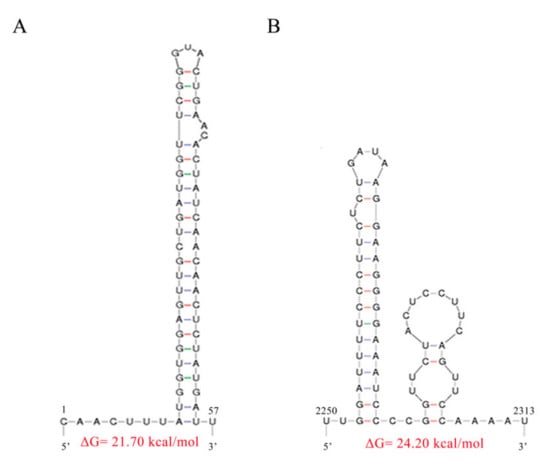 Since the stem-loop structures at the 5´- and 3´- termini are characteristic of mitoviruses, we used MFOLD software to predict the potential secondary structures of the 5′- and 3′- terminal sequences of FodMV1. The result obtained revealed that the 5′- and 3′-UTRs could be folded into a predicted stable stem-loop structure (Figure 4A,B), with ΔG values of 21.70 kcal/mol for the 5´-terminal sequence, and 24.20 kcal/mol for the 3´-terminal sequence. Nevertheless, comparison of the nucleotide sequence constituting the stem-loops of FodMV1 and other mitoviruses showed no significant similarities between them.