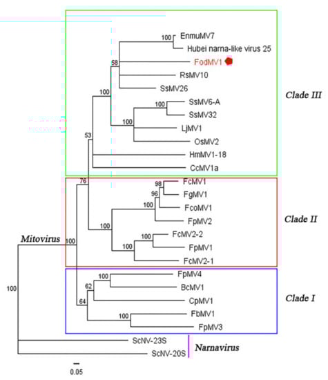 3.3. Phylogenetic Relationship between FodMV1 and Other Mitoviruses.