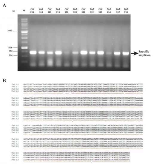To determine if the dsRNA element observed in the remaining 39 isolates corresponded to mitovirus FodMV1, we carried out amplifications by RT-PCR using the corresponding dsRNA extracts and specific primers designed from the nt sequence of the RdRp of FodMV1. The expected amplicon of approximately 0.7 kb was obtained as a result of the RT-PCRs in 22 of the 39 isolates analyzed (Figure 6A). These amplicons were purified from the agarose gel and sequenced. Subsequent multiple alignment between the corresponding region of the RdRp of FodMV1 and the nt sequences of the amplicons obtained from the 22 different Fod isolates showed nt identities between 95%–100% (Table 3). Identity was complete (100%) among the four dsRNA sequences identified in the 4 isolates from Colombia (Figure 6B), and between 95%–97% for the dsRNAs from the remaining 18 isolates, all of them originating from Spain. Regardless of the geographic origin, all FodMV1-infected isolates were of the same R2I race-group (Table 3).