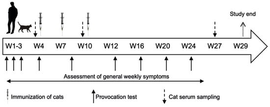 Study design of the combined human and animal trial. Prior to immunization of their cats, participants performed a baseline assessment of their allergic symptoms using the HypoScore (OSSS and petting time) and GWSS. In the course of the study, they performed the provocation test every four weeks and recorded their general symptoms weekly without provocation using the GWSS. Cats received three injections of 100 µg Fel-CuMV (HypoCatTM) at intervals of three weeks (in study weeks 4, 7 and 10) subcutaneously. Cat sera were collected at baseline, week 10, and week 27.