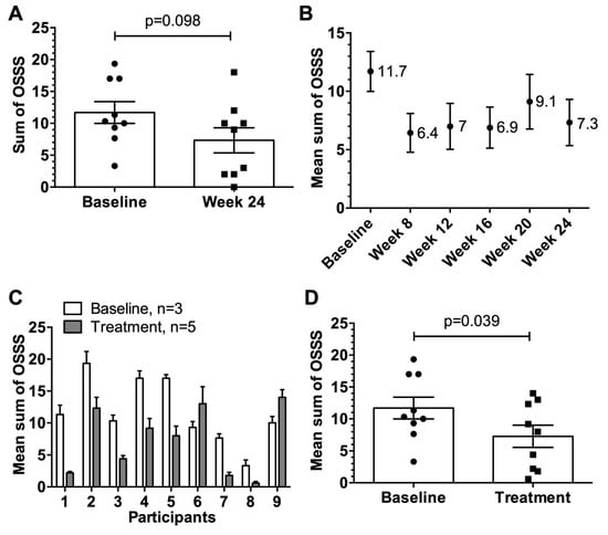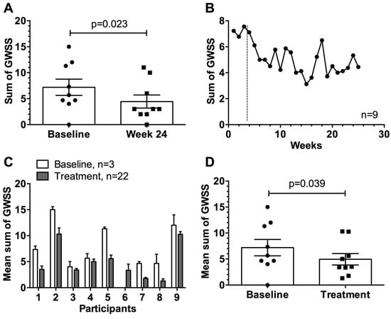 There were eight of possible nine successes, meaning that the GWSS of eight participants were lower at week 24 compared to baseline (Figure 4A). The mean GWSS at baseline compared to week 24 was significantly reduced from 7.2 to 4.4 (p = 0.023).
