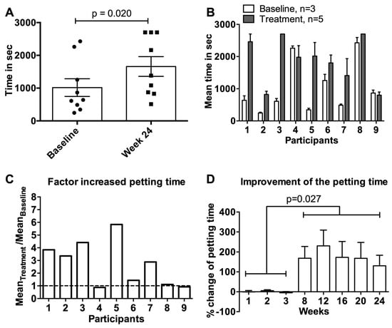 Time of petting as part of the provocation test. (A) Mean petting time with SEM in seconds of nine participants comparing baseline (n = 3) versus week 24 at the end of the study. (B) Individual mean petting time with SEM in seconds at baseline (n = 3, weeks 1–3) compared to treatment period (n = 5, weeks 8, 12, 16, 20 and 24). (C) Factor of changed petting time for each participant shown as ratio of the mean timepoints during treatment (n = 5, weeks 8, 12, 16, 20 and 24) to mean baseline time (n = 3, weeks 1–3). (D) Change in % of the mean petting time with SEM of nine participants during the treatment period in weeks 8, 12, 16, 20 and 24 compared to mean baseline in weeks 1–3. Statistical significances were obtained by an exact Wilcoxon matched-paired signed rank test.