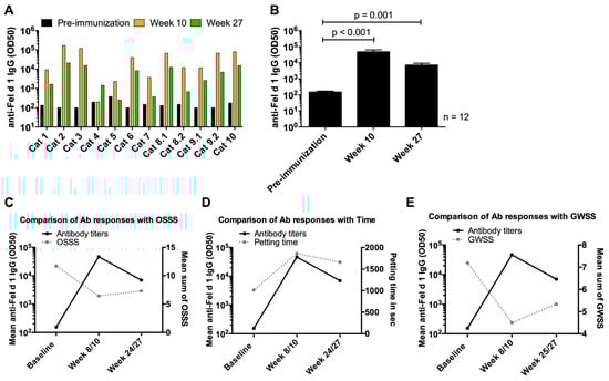 Antibody responses in cat sera. (A) Anti-Fel d 1 IgG antibody titers in cats before and after immunization, n = 12. (B) Mean anti-Fel d 1 IgG antibody titers with SEM, n = 12. (C) Anti-Fel d 1 IgG antibody titers in cats at baseline (before immunization), week 10 and 27 vs. OSSS at corresponding timepoints baseline (before immunization), week 8 and 24. (D) Anti-Fel d 1 IgG antibody titers in cats at baseline (before immunization), week 10 and 27 vs. petting time at corresponding timepoints baseline (before immunization), week 8 and 24. (E) Anti-Fel d 1 IgG antibody titers in cats at baseline (before immunization), week 10 and 27 vs. GWSS at corresponding timepoints baseline (before immunization), week 8 and 25. (C-E) Data included from participants (n = 9) with corresponding study cats (n = 9). Statistical significances were obtained by an exact Wilcoxon matched-paired signed rank test.