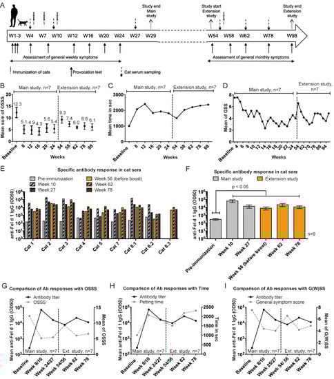 Extension study: Changes in allergic symptoms of participants after booster injection of cats. (A) Study design of the main and extension study including seven participants and nine cats. In addition to the main study, the participants performed a provocation test before the boost (week 56) followed by four additional provocation tests in study weeks 58, 62, 78, and 98. Participants also recorded their general organ specific symptoms (GSS) without provocation at monthly intervals during the extension study. The cats received a boost immunization of 100 µg Fel-CuMV subcutaneously in week 56. In addition to the collected serum samples of the main study, cat sera were also collected in study weeks 56, 62, and 78. (B) Mean OSSS with SEM over the course of the main and extension study of seven participants. (C) Mean petting time over the course of the main and extension study of seven participants. (D) Mean general symptoms (G(W)SS) over the course of the main (assessed weekly) and extension (assessed monthly) study of seven participants. (E) Measurement of anti-Fel d 1 IgG in cat sera of nine cats participating in the main and extension study. (F) Mean anti-Fel d 1 IgG antibody titers with SEM in cat sera. (G) Mean anti-Fel d 1 IgG antibody titers in cats vs. mean OSSS over the course of the main (baseline (before immunization), week 8/10 and 24/27) and extension study (week 54/56 (before boost), week 62 and 78). (H) Mean anti-Fel d 1 IgG antibody titers in cats vs. mean petting time over the course of the main (baseline (before immunization), week 8/10 and 24/27) and extension study (week 54/56 (before boost), week 62 and 78). (I) Mean anti-Fel d 1 IgG antibody titers in cats vs. mean G(W)SS over the course of the main (baseline (before immunization), week 8/10 and 24/27) and extension study (week 54/56 (before boost), week 62 and 78). (G-I) Data included from participants (n = 7) with corresponding study cats (n = 7). Statistical significances were obtained by an exact Wilcoxon matched-paired signed rank test.