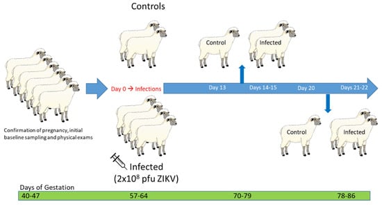 Experimental design of Zika virus (ZIKV) infection of mid-gestation pregnant ewes. Six specific pathogen-free (SPF), mid-gestation pregnant, Polypay ewes were used in this experiment and confirmed pregnant by transabdominal ultrasonography upon receipt. On day D0 post-infection (PI), corresponding with 57–64 DG, four ewes were inoculated with two injections of 1 × 108 PFU ZIKV; two ewes were used as non-infected controls. Whole blood and serum were collected daily from all ewes over the first week PI. Control animals were euthanized on D13 and D20 PI; one infected animal was euthanized on D14, D15, D21, and D22 PI. Necropsies of ewes and fetuses were immediately performed on each animal following euthanasia.
