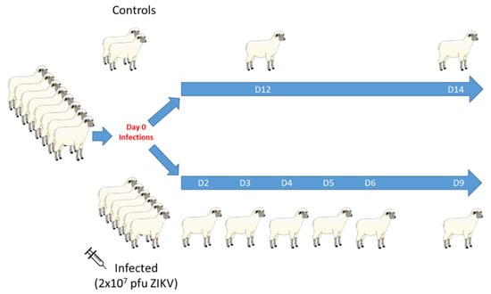Six sexually mature, intact male sheep were inoculated with two 1 mL injections of 1 × 107 PFU ZIKV intravenously and subcutaneously on D0 PI; two uninfected animals served as controls (Figure 2). A back titration was performed on aliquots of ZIKV inoculum transported in the same way as the infecting inoculum to confirm the dose and stability of the virus. One ram was euthanized on D2, D3, D4, D5, D6, and D9 PI and comprehensive post-mortem examinations were immediately performed. Control rams were euthanized on D12 and D14 PI. Serum and whole blood (4 mL in 14.2% Acid Citrate Dextrose [ACD]; 2 mL in EDTA-treated tubes) was collected from the two control rams and the infected animals euthanized on D6 and D9 PI twice daily for the first three DPI, then daily for three more days. Serum and blood were not collected from the animals euthanized on D2, D3, D4, and D5 PI.