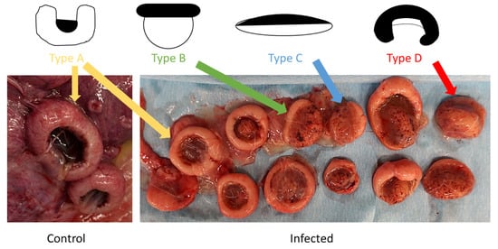 Placental abnormalities were present on gross post-mortem examination in the infected animals. For each animal, the total number of placentomes was counted and placentomes were characterized as either “Type A, B, C or D,”. Type A is classified as a normal placentome with a majority of maternal tissue (known as the “caruncle”) surrounding fetal tissue (known as the “cotyledon”), Types B consists of 30% inversion exposing the upper rim of the cotyledon, C consists of approximately 50% of inversion with flattening of the placentome, and Type D is a complete inversion of the placentome with fetal tissue completely surrounding maternal tissue [56,57]. The number of the placentomes of each ewe was within normal limits, but all infected animals had at least some degree of placentome inversion (“advanced”) morphology (Figure 3; Table 1).