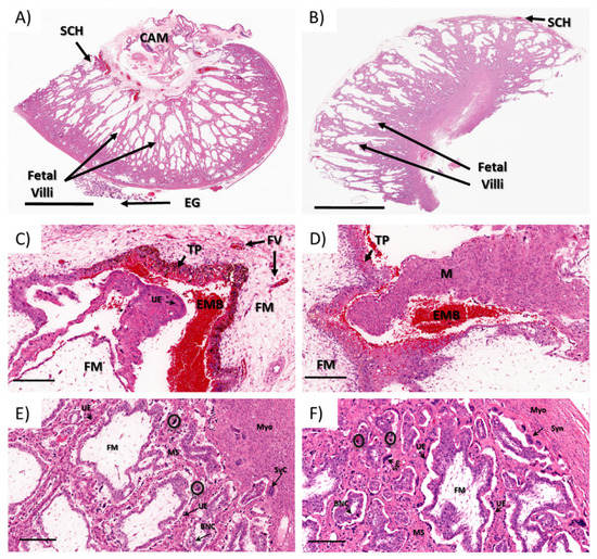 Regardless of the differences in the gross morphology of Type A through Type D placentomes (Figure 4A,B), all of the placentome samples analyzed from control and ZIKV-infected animals exhibited similar histological patterns (Figure 4C–F). The placentomes were composed of the maternal plates (caruncle) tightly interlaced with the fetal villi (cotyledon) (Figure 4E,F). The maternal plates were lined by a moderately plump single, cuboidal to columnar epithelium with lacy, palely eosinophilic cytoplasm and basilar oriented, round nuclei with coarse chromatin and variably evident nucleoli supported by a variably dense fibrovascular stroma. Multifocally, the maternal epithelium was markedly attenuated with a small, dense nuclei. These areas of maternal epithelium attenuation were often associated with syncytial formation (Figure 4E,F). The syncytia were scattered throughout the maternal–fetal interface, and were more frequent in the deep regions of the placentomes closer to the myometrium (Figure 4E,F). The fetal villi were composed of chorionic epithelium supported fetal mesenchyme. The chorionic epithelium was mainly composed of columnar to cuboidal, segmentally stratified epithelium with large nuclear vesicular chromatin and unapparent nuclei admixed with scattered foamy giant, bi- or trinucleate trophoblasts with centrally located, moderately dense to coarse chromatin. The fetal mesenchyme was composed of low numbers of spindle cells with undefined cell borders supported by a loose fibrovascular stroma.