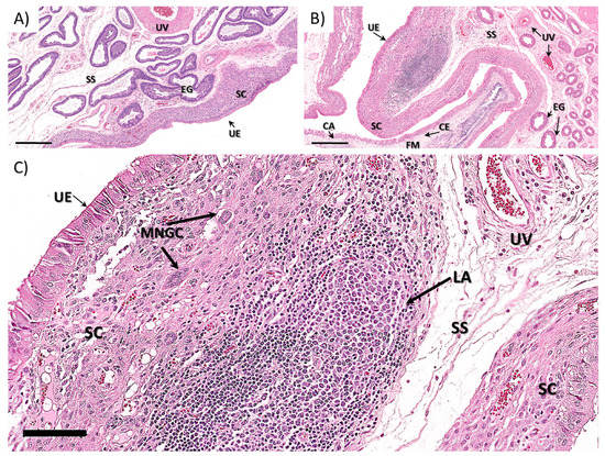 Interplacentomal ovine endometrium from (A) control and (B,C) ZIKV-infected dams (H&E). (A) Endometrium with uterine epithelium, stratum compactum, stratum spongiosum and endometrial glands in control ewe. (B,C) Endometrium with uterine epithelium, stratum compactum, stratum spongiosum and endometrial glands in ZIKV-infected ewe (I2), with well-organized lymphoid aggregate composed of a center of macrophages surrounded by multiple layers of lymphocytes and fewer plasma cells. Additionally, there are fewer giant multinucleated cells (multinucleated, giant macrophages, Langerhan’s type, presumptively) within the stratum compactum close the inflammatory infiltrate. Chorioallantoic membrane (CA); endometrial glands (EGs); fetal mesenchyme (FM); myometrium (Myo); uterine epithelium (UE); stratum compactum (SC); stratum spongiosum (SS); chorionic epithelium (CE) and multinucleate giant cells (MNGCs). Bars: 200 µM.