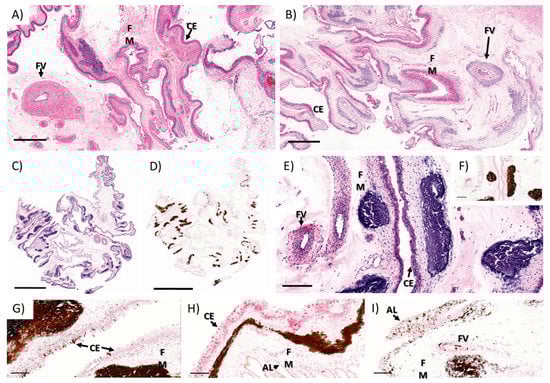 The most striking lesion was the mineral deposition observed in the chorioallantoic membrane rather than at the maternal–fetal interface. The mineralization was observed in the superficial fetal mesenchyme below the trophectoderm that formed, multifocal to coalescing, large clusters composed of moderately pale to dark basophilic areas of mineralization which stain dark brown to black with Von Kossa histochemical stain (Figure 6A–I). Frequently, there was multifocal perivascular and mural mineral deposition, often extending through the adventitia and the tunica media of the affected vessels, rarely extending into the intima (Figure 6B,I). There was a segmental, thin band of spindle cells just adjacent to the chorionic and allantoic epithelium that had grainy, dark brown granular intracytoplasmic material (early stages of mineral deposition) (Figure 6G,H). Moreover, there was multifocal and segmental mineral accumulation in the chorionic (Figure 6G) and allantoic (Figure 6I) epithelium of the chorioallantoic membrane (highlighted with Von Kossa stain).