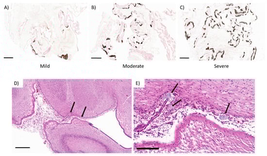 Top: Chorioallantoic membrane from the interplacentomal area, Von Kossa stain. (A) Mild, (B) moderate, and (C) severe mineral accumulation patterns used to evaluate the samples from control and ZIKV-infected ewes. Bottom: Fetal brain; telencephalon between hippocampus and thalamus (I3F2) with multifocal areas of pale basophilic mineral accumulation (black arrows) within the leptomeninges between the hippocampus and the thalamus. (A–D) bars: 200 µM; (E) bar: 50 µM.