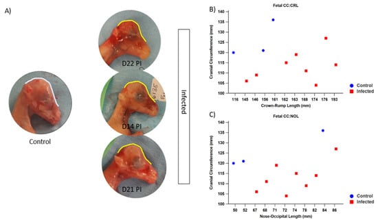 Fetal number and viability were assessed on a weekly basis using transabdominal ultrasonography; all fetuses remained viable during the course of the infection period. At the time of necropsy, grossly misshapen heads were noticeable in most of the fetuses of infected ewes (Figure 8A). Fetal measurements taken during necropsy confirmed that the CC of infected fetuses (mean = 113.13 mm, SD = 7.43) was significantly smaller than that of control fetuses (mean = 125.67 mm, SD = 8.96) (p = 0.042). Fetal measurements were used to calculate morphometric ratios to better assess the relative growth of infected fetuses compared with control fetuses. Of note, the cranial circumference to crown–rump length (CC:CRL) and cranial circumference to nose–occipital length (CC:NOL) were significantly smaller in fetuses of infected ewes when compared with that of control fetuses (p = 0.006 and p = 0.041, respectively) (Figure 8B,C).