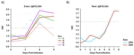 Immune response was determined for infected sheep in both experiments by ZIKV IgM ELISA. (A) The immune status ratio (ISR), a representation of IgM antibody response, by days post-infection of all infected ewes. (B) The ISR by days post-infection of rams euthanized on D6 and D9 (ED6 and ED9, respectively). In both cases, an ISR ≥ 1.5 is indicative of seroconversion to ZIKV; in both studies, none of the control rams or ewes seroconverted to ZIKV.