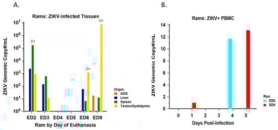 ZIKV-positive tissues in all rams by day of euthanasia (ED). (A) Tissues collected at the time of necropsy were cultured and tested for presence of ZIKV RNA; “C+” indicates tissues that were culture positive; bars represent the ZIKV genomic copy number found in RT-PCR+ tissues. (B) Blood was collected daily for the first 6 days PI from rams euthanized on D6 and D9; PBMC isolated from whole blood was tested for presence of ZIKV RNA by RT-PCR; bars represent the ZIKV genomic copy number found in PBMC by DPI.