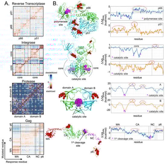 Underlying allosteric communications were found within HIV-1 proteins. (A) Allosteric signaling maps (single-point mutation screening) of HIV-1 Reverse Transcriptase, Integrase, Protease, and Gag. Structural presentation using RT (pdb 3T19), IN (reconstructed from pdb 1K6Y and 1EX4), PR (pdb 2PC0), and Gag model from Su et al. [87]; (B) Allosteric-free energies (ΔΔgsite) on specific catalytic or cleavage sites (magenta spheres) were estimated based on individual perturbations at single residues (x-axis) to demonstrate the resulting stabilizing (ΔΔgsite < 0) or destabilizing (ΔΔgsite > 0) effects. The possible mutations which may potentially destabilize the sites of interest, are highlighted in red spheres and red dash ovals.