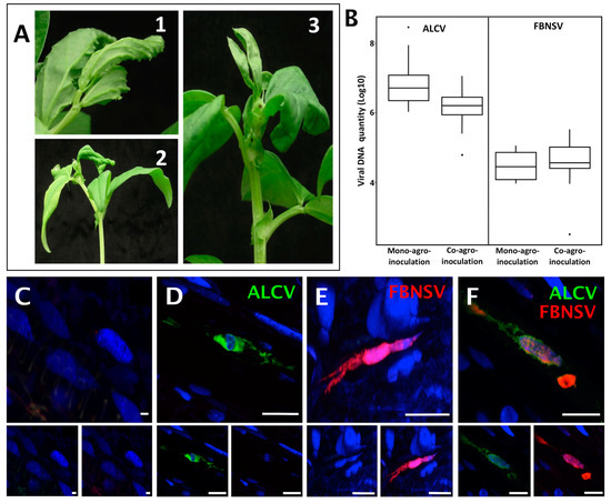 Localization of FBNSV and ALCV DNA in broad bean host plants. Visualization of ALCV symptoms (A1) and FBNSV symptoms (A2) on late stage of infection on broad bean plants, where symptoms are easier to see, and ALCV + FBNSV symptoms (A3) on early stage of infection, when over-curling of leaves due to FBNSV do not yet totally mask ALCV-associated vein swelling. (B) Box-plots of viral DNA amounts (log10 of the copy number, see Materials and Methods) of each virus in mono- and co-agro-inoculated broad bean plants. The box-plot on the mono- and co-infected plants represent n = 9 for FBNSV, n = 11 for ALCV and n = 15 for co-infected plants, respectively. C to F: Localization of ALCV DNA (green probe) and FBNSV DNA (8 segments labeled, red probe) in phloem tissues of broad bean plants either mock infected (C), or co-infected with the two viruses (D–F). Most cells contain either ALCV (D) or FBNSV (E) alone, but they can also occasionally be co-infected (F). Top panel in C to D are images with merged color channels and the corresponding split channels are at the bottom left (green) and right (red). Each image corresponds to maximum intensity projections. The scale bar of each image represents 25 µm. Cell nuclei are DAPI blue-stained.