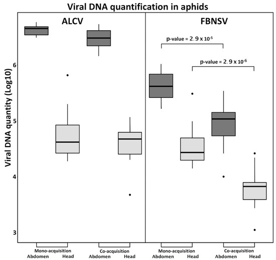All statistical analyses were conducted with the package stats of the R software package, v3.5.0 [30]. As also indicated in the figure legends, boxplots display DNA quantification in source plants performed on n = 9, n = 11 and n = 19 plants infected, respectively, with FBNSV, ALCV and both viruses. Differences in the amounts of each virus DNA in abdomens and heads were tested with a Tukey HSD test on the transformed log10 values. ANOVA were performed with the virus (ALCV or FBNSV), the “organ” (abdomen or head) and the type of infection (mono- or co-infection) as the tested variables.
