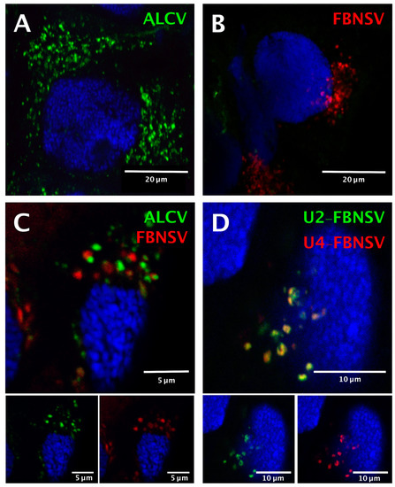 Because the insects were killed and processed for FISH analysis 2 days after the end of the AAP, after a “purging” period on healthy plants, detection of the two viruses confirms that neither entry nor persistence is hindered by co-infection. The intra-cellular FBNSV and ALCV aggregates (fluorescent foci) that were detected in the same individual gut cells were similar in size and shape, and were distributed predominantly around the nucleus (Figure 3C), just as in aphids fed on singly infected plants (Figure 3A,B). Remarkably, each aggregate was strictly specific to either ALCV or FBNSV, and the respective fluorescent labeling never overlapped (Figure 3C).