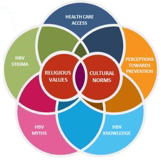 The coding of the interview transcripts revealed two overarching themes impacting AIs’ barriers to health care in regard to HBV: (1) religious values and (2) cultural norms. Within the two overarching themes, it is essential to highlight the diversity of culture and religion across the African continent, which was identified and described within interviews. Each country and each community within countries represents diverse cultural and religious practices, which may not be generalizable for the entire African continent, but the overarching themes are significant contributors to how health is viewed. Subthemes identified were (1) health care access, (2) perception towards prevention, (3) HBV awareness, (4) HBV myths, and (5) stigma. Subthemes were interconnected with cultural norms and religious preferences. Both overarching themes and subthemes are described below and presented in