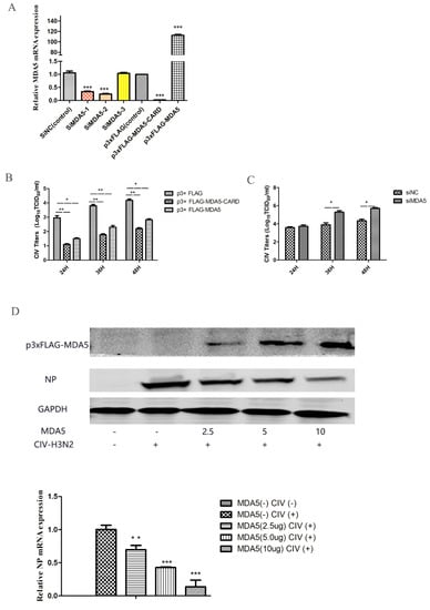 Cytokine expression is stimulated by a variety of factors, of which MDA5 stimulated expression of a subset of cytokines. Numerous studies have shown that IFN-β and ISGs can reduce virus production when the host is infected with virus []. To investigate whether canine MDA5 could inhibit replication of the influenza virus, we studied the replication curve of CIV. We found that the replication titer of CIV was reduced at different time points, especially at 36 h with dog MDA5 overexpression (Figure 2A). Further, when MDA5 was silenced, the replication titer of CIV increased (Figure 2B). The results indicate that MDA5 inhibits CIV replication. Additionally, when MDCK cells were transfected with different doses of p3xFLAG-MDA5 and infected with CIV, the expression level of the viral protein NP decreased with the increased plasmid dose (Figure 2C). This reverse dependence may be due to MDA5-induced inflammatory responses that promote viral replication through the RIG-I pathway recruiting viral target cells.