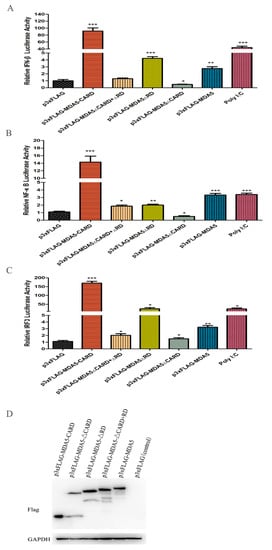 Effect of canine MDA5 domain on IFN-β/IRF3 and NF-κB promoter. p3xFLAG, p3xFLAG-MDA5-CARD, p3xFLAG-MDA5-ΔCARD, p3xFLAG-MDA5-ΔRD, p3xFLAG-MDA5-CARD+RD, p3xFLAG-MDA5 (500 ng/well), and poly I:C (500 ng/well) were transfected with pGL3-IFN-β (100 ng/well) (A), pGL3-NF-κB (100 ng/well) (B), pGL3-IRF3 (100 ng/well) (C), and pRL-TK (50 ng/well) in 24-well plates. Following, cells were harvested, and the relative fluorescein expression levels of IFN-β were measured after 36 h. Poly I:C represent a positive control. Data were tested by one-way ANOVA with Fisher’s least significant difference (LSD) post-hoc correction. * p < 0.05; ** p < 0.01; *** p < 0.001. Error bars indicate standard deviation. (D) The protein expression of five plasmids in MDCK cells was detected by western blot, and the GAPDH was used as a control.