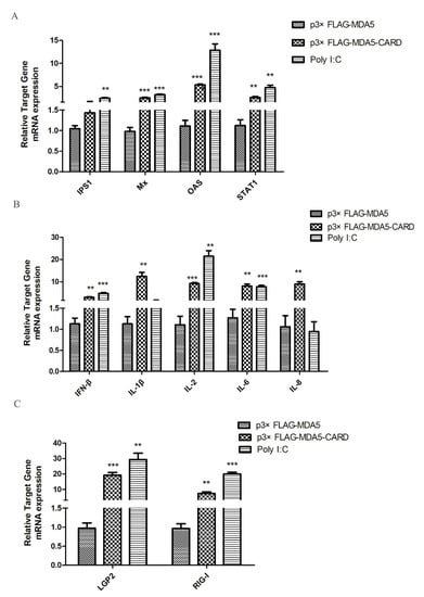 In addition, overexpression of the canine MDA5 CARD region enhances the expression of antiviral proteins such as Mx, STAT1, and OAS. Canine MDA5 mediates signal transmission by activating antiviral and proinflammatory responses. Furthermore, overexpression of canine MDA5 lacking C-terminal RD showed a stronger ability to induce the IFN-β promoter than full-length canine MDA5. Studies have shown that the C-terminal RD region of human MDA5 neither activates nor inhibits promoter expression [], suggesting that the RD region of MDA5 differs across species. In addition, CARD overexpression of canine MDA5 increased expression of the pattern recognition receptors RIG-I and LGP2. Studies have shown that IFN-α and IFN-β can activate MDA5, RIG-I, and TLR3 mRNA expression in human lung adenocarcinoma epithelial cells and human umbilical vein endothelial cells []. Further studies have shown that the MDA5 and RIG-I genes are activated by IFN-α [,]. Therefore, MDA5 increases the expression levels of RIG-I and LGP2 genes through the CARD region, due to up-regulated IFN-α and IFN-β stimulation.