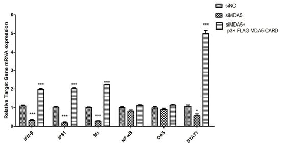 Three specific siRNAs from different regions of MDA5 were synthesized to further explore the function of canine MDA5, and one was selected by RT-qPCR. As shown in (Figure 2A), siMDA5-2 significantly inhibited the expression of MDA5 (p < 0.05). The siMDA5-2 or siNC and pRL-TK were cotransfected with a pGL3-IFN-β promoter into MDCK cells. After 12 h, cells were treated with poly I:C and control, respectively. After MDA5 gene silencing, RT-qPCR was used to detect expression of the RIG-I pathway and its downstream ISGs gene (Figure 5). Expression of related genes was inhibited, IFN-β (5.2-fold, p < 0.05) and IPS1(7.6-fold, p < 0.05) were significantly decreased. Furthermore, Mx expression was significantly down-regulated, which was approximately 1/7 of the control group (p < 0.05). After MDA5 gene silencing, MDCK cells were stimulated with p3xFLAG-MDA5-CARD, and the expression level of the inhibited gene was up-regulated. These results indicated that knockdown of the MDA5 gene reduced inflammatory factor production and attenuated antiviral activity. Furthermore, canine MDA5 was found to be essential for activating antiviral responses, via the CARD region.