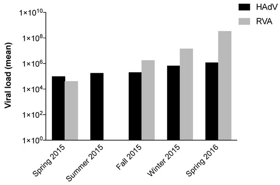 Human adenovirus (HAdV) and rotavirus A (RVA) mean viral load during the study period. Quantification analysis of viral load (mean) detected by qPCR (HAdV) and RT-qPCR (RVA) in raw sewage samples collected between spring 2015 and spring 2016 in Catalonia.