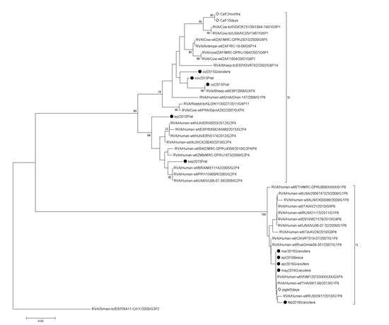 RVA-positive strains, by the qPCR method, were subjected to VP6 amplification and Sanger sequencing. The results showed the circulation of the genotypes I1 and I2 in Catalonia (Figure 3). Samples collected in 2015 belonged to the I2 genotype and were grouped in a different cluster together with human and animal (antelope, cow and sheep) wild-type strains. On the other hand, samples collected in 2016 belonged to the I1 genotype, grouped together with human wild-type strains of different G/P genotypes circulating worldwide.