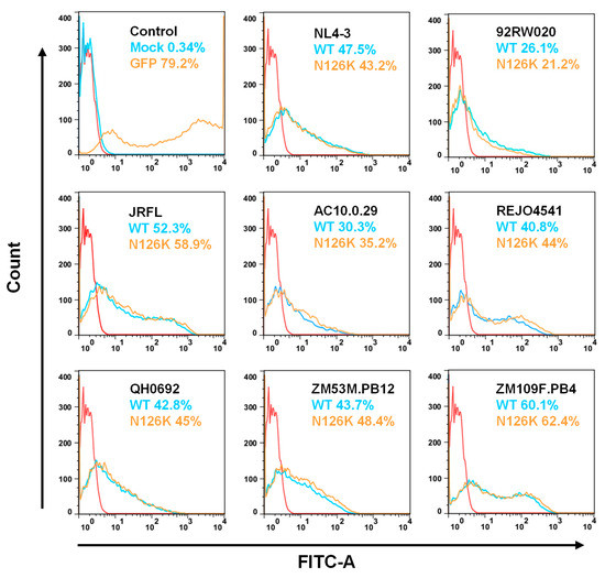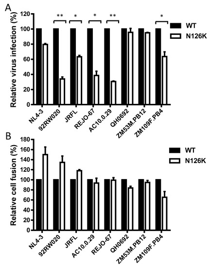 3.2. Effect of N126 Mutation on the Functionality of Divergent HIV-1 Envs