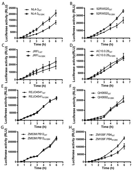 Kinetics of diverse HIV-1 Env-mediated cell-cell fusion determined by DSP-based assay. The fusion activities of viral Envs derived from HIV-1 NL4-3 (A), 92RW020 (B), JRFL (C), REJO4541 (D), AC10.29 (E), QH0692 (F), ZM53M.PB12 (G), and ZM109F.PB4 (H) were respectively measured at different time points, and the fusion kinetics of wild-type (WT) and its N126K mutant Envs was compared directly. Data were derived from the results of three independent experiments and are expressed as means ± standard deviations (SD).
