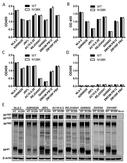 We next focused on characterizing the effect of N126K mutation on the expression and processing of viral Env. Firstly, a capture ELISA-based method with the human anti-gp120 monoclonal antibody VRC01 and anti-gp41 monoclonal antibody 10E8 was applied as described previously [23,25,26]. It is known that VRC01 can react with both the uncleaved gp160 and cleaved gp120 proteins in the lysates of transfected cells and with the secreted gp120 protein in the cell culture supernatants, whereas 10E8 reacts only with the gp160 and cleaved gp41 in the cell lysates but not with gp120 in the culture supernatants, thus their reactivity can theoretically reflect the expression profiles of gp160/gp120/gp41. As shown in Figure 4A,B, both VRC01 and 10E8 detected similar levels of the proteins in the lysates of HEK293T cells transfected with the WT and mutant Env-expressing plasmids. Simultaneously, VRC01 reacted equivalently with the cell culture supernatants, while 10E8 had no reaction with the supernatants as expected (Figure 4C,D).