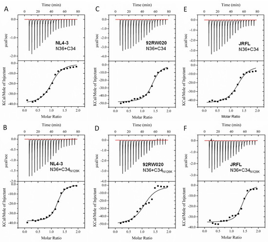 The NHR-derived peptide N36 and CHR-derived peptide C34 were initially used to determine the crystal structure of 6-HB thus being considered a core helical sequence of gp41 [4]. We previously found that N126K mutation could significantly increase the thermostability of 6-HB structure modeled by the NL4-3 Env-derived N36 and C34 peptides [25]. In this study, we synthesized a panel of N36 and C34 peptides corresponding to the Env sequences of NL4-3, 92RW020, and JRFL, as illustrated in Figure 1D. The effect of N126K mutation on the α-helicity and thermostability of 6-HB was further analyzed by circular dichroism (CD) spectroscopy. As shown in Figure 7 and Table 3, the N126K mutation did not affect the α-helicity of each 6-HBs; however, it consistently enhanced their thermal stabilities. Specifically, the N36/C34N126K-based 6-HBs of NL4-3, 92RW020, and JRFL exhibited increased Tm values of 4.7, 5.3, and 4.8 °C as compared to the wild-type N36/C34-based ones, respectively. We also analyzed the interaction between the wild-type and mutant peptides by isothermal titration calorimetry (ITC), which measures the thermodynamic parameters of the peptide pairs that reflect an instant molecular interaction, whereas the CD spectroscopy measured the α-helicity and thermostability of a preformed peptide complex. Figure 8 and Table 3 show the results, including the reaction stoichiometric (N), binding constant (K), enthalpy (ΔH), and entropy (ΔS). Obviously, the interaction of N36 and C34 peptides in the presence and absence of N126K was a typical enthalpy-driven reaction, in which plenty of heat was released, and the N126K mutation could slightly increase the binding constant of C34 peptides.