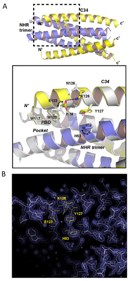 Structural basis for the N126K mutation-mediated stabilization 6-HB conformation. (A) Upper part, an overview 6-HB structure comprising of N36/C34N126K peptides derived from HIV-1 strain NL4-3. N36 is colored in blue, C34N126K is colored in yellow. The dashed line box area highlights the site of conformational changes associated with N126K mutation, which is magnified below. Lower part, magnified view of the structural superimposition of the N36/C34N126K structure with the N36/C34 structure colored in gray (PDB: 1AIK). Residues involved in conformational changes and residues forming the PBD domain are shown with stick models. (B) Final 2Fo-Fc map (contour 1.5s) of N36/C34N126K crystal structure with superimposed model. Residues K126, E123, Y127 and H53 involved in side chain conformation changes between C34 and C34N126K are colored in yellow and labelled.