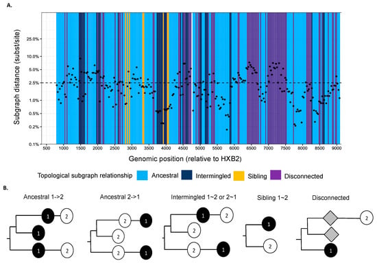 We used phyloscanner version 1.8.0 to reconstruct directed HIV-1 transmission networks from deep sequences [46]. Briefly, phyloscanner analysis starts with HIV deep-sequence reads from a set of infected individuals that are mapped against reference sequences of the entire genome. Across the genome, sliding windows are defined, and for each window, paired-end reads from all individuals that overlap the window are extracted and aligned, and deep-sequence phylogenies reconstructed. In our analysis, windows were of length 250 bp and incremented by 25 bp across the entire genome. Next, viral lineages in the deep-sequence phylogenies were attributed to each individual using maximum parsimony ancestral state reconstruction, which defined larger parts (called “subgraphs”) of the deep-sequence phylogenies that are attributed to viral evolution within each individual. Using Sanger sequencing, typically one sequence is available per person, and in this case, each subgraph consists of the tip sequence only that corresponds to the sampled individual. Using deep-sequence data, subgraphs of each individual typically comprise several tips and inner nodes in the phylogeny, and this information can be used to characterize the relationship of individuals in terms of distance between subgraphs and topological relationship between subgraphs. Figure 2 shows the subgraph distances (y-axis) and subgraph topologies (color) between a pair of individuals in the phylogenies that were reconstructed from the overlapping 250 bp read alignments across the genome. The subgraph distances are used to infer phylogenetic linkage, and the subgraph topologies are used to infer the likely direction of transmission between individuals (Figure 2b). A phyloscanner analysis returns for each pair of individuals phylogenetic scores for linkage and transmission direction that are calculated across all genomic windows [46,47,48]. The scores indicate the proportion of genomic windows with phylogenetic support for linkage and transmission direction, after accounting for overlap between the read alignments.