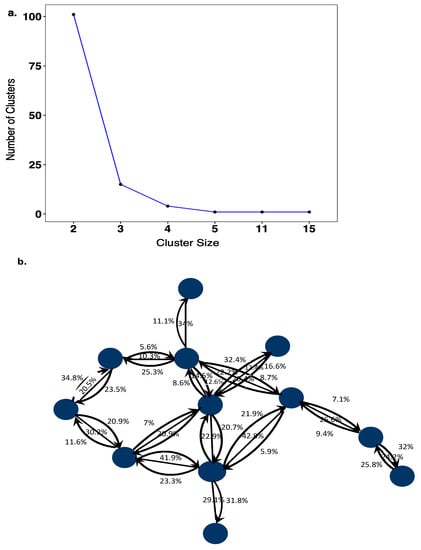 (a) Cluster size distribution of HIV-1 transmission networks. The cluster size distribution of transmission networks consisted of 101 sequences that were linked as pairs, 15 clusters of 3 linked sequences, 4 clusters of 4 linked sequences, 1 cluster of 5 linked sequences, 1 cluster of 11 linked sequences and 1 cluster of 15 linked sequences. (b) Transmission pairs with phylogenetic evidence for the direction of HIV-1 transmission. The blue colored circles represent sequences that are linked to one another with phyloscanner scores (%) showing support for transmission in either direction between individual sequences. Source–recipient pairs that had phyloscanner scores >60% for linkage and >60% for one direction were considered highly supported.