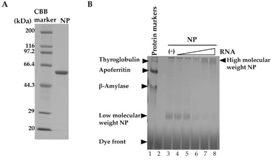 Recombinant NP was prepared as previously described []. Bacteria cell pellets were suspended and sonicated in lysis buffer containing 20 mM Tris-HCl (pH 7.9), 50 mM NaCl, 5 mM imidazole, and proteinase inhibitor cocktail (Nacalai Tesque). The lysate was treated with 0.15 mg/mL RNase A (Nacalai Tesque) at 35 °C for 30 min in the presence of 10 mM MgCl2. The lysate was purified using a His60 Ni Superflow Resin (Clontech Laboratories Inc, CA, USA) followed by a heparin column (Sigma–Aldrich) per the manufacturers’ instructions. The protein was eluted from the column using buffer containing 10 mM Tris-Cl (pH 7.9) and 2 M NaCl and dialyzed in storage buffer (50 mM Tris-Cl [pH 7.9] and 50 mM NaCl). The protein was stored at 4 °C for 3 days to dissociate into monomers [], frozen in liquid nitrogen, and stored at −80 °C.