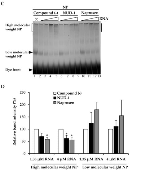 Effects of NUD-1 and naproxen on nucleoprotein (NP) oligomerization. (A) Purified recombinant NP was analyzed using 10% SDS-PAGE followed by Coomassie brilliant blue staining. (B) The migration of protein markers (thyroglobulin, 669 kDa; apoferritin, 443 kDa; β-amylase, 200 kDa) and NP mixed with yeast (0.05, 0.15, 0.45, 1.35, and 4 μM) was analyzed using blue native polyacrylamide gel electrophoresis (BN-PAGE). (C) NP (2.5 μM, equivalent to 2 μg) was mixed with RNA (0.15, 0.45, 1.35, and 4 μM) in the absence of any compound or in the presence of 100 μM NUD-1 or naproxen and incubated at room temperature overnight before analysis via BN-PAGE. The intensity of the smear at the top of the gel (enclosed by bracket) was quantified using ImageJ software. The relative band intensity in the presence of NUD-1 or naproxen was calculated in reference to that in the absence of a compound. Three independent experiments were performed, and representative data are shown. (D) The relative band intensities of high-molecular-weight and low-molecular-weight NP treated with 1.35 µM RNA (no compound, lane 4; NUD-1, lane 8; naproxen, lane 12), and NP treated with 4 µM RNA (no compound, lane 5; NUD-1, lane 9; naproxen, lane 13) were quantified from three independent experiments. The asterisk indicates p < 0.05.