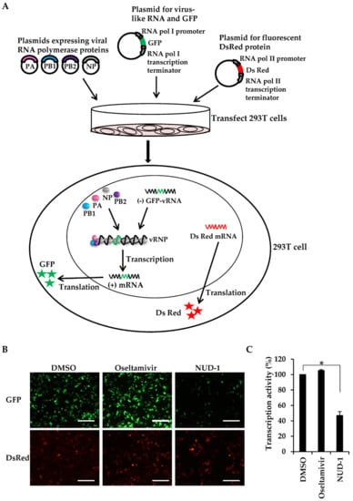 Because NP oligomerization is important for the formation of the vRNP complex, the transcription template in influenza virus, we investigated whether NUD-1 interferes with transcription activity. We used a minigenome reporter system [,], in which vRNPs can be reconstituted by transfecting cells with plasmids expressing the vRNP components (virus-like RNA, PB1, PB2, PA, and NP). The negative strand of the viral RNA genome encoding GFP is transcribed in the cells under the control of cellular RNA polymerase I promoter and forms a complex with polymerase proteins to form vRNP (Figure 2A). Thus, GFP is expressed upon the successful formation of vRNP and RNA-dependent RNA polymerase transcription activity in 293T cells (Figure 2A). DsRed fluorescent protein expression is driven by cellular RNA polymerase II, hence was used as a control. Using this system, we first confirmed that favipiravir, a known viral transcription inhibitor, showed dose-dependent inhibition of GFP expression (Figure S4). Thus, the effect of NUD-1 on viral transcription was tested. The expression of DsRed was similar in DMSO-, oseltamivir-, and NUD-1-treated cells, meaning that NUD-1 did not exhibit cytotoxic effects, which is in accordance with the cell viability assay results in Figure S1C. The cells treated with DMSO and oseltamivir expressed GFP at comparable levels, indicating successful transcription activity (Figure 2B,C). As expected, GFP expression was significantly inhibited in the presence of NUD-1, denoting the suppression of viral transcription activity.