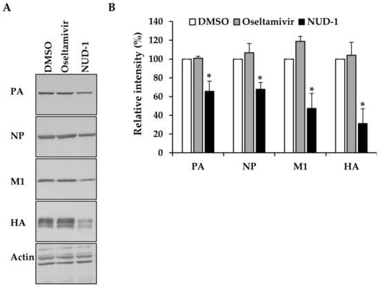 In the course of viral replication, newly synthesized polymerase proteins and NP are imported into the nucleus, where they are assembled into cRNPs and vRNPs to support late transcription [,]. We thus investigated the effect of NUD-1 on the expression of early (NP and PA) and late (M1 and HA) viral proteins. The expression of viral proteins in cells treated with oseltamivir or DMSO was not inhibited (Figure 3). Oseltamivir inhibits virus replication by preventing the release of progeny virions from infected cells; hence, it does not interfere with protein synthesis. By contrast, in the presence of NUD-1, viral protein levels were reduced. The extent of inhibition of late viral proteins (M1 and HA) was notably greater than that of early viral proteins (NP and PA), suggesting the impairment of NP oligomerization and thus, reduced formation of cRNP and vRNP for late transcription.