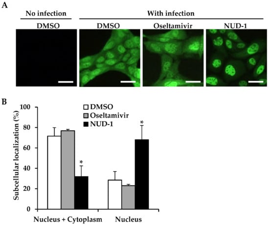 Subcellular localization of nucleoprotein (NP). Madin–Darby canine kidney cells were infected with the A/WSN/33 virus (multiplicity of infection = 5) in the presence of DMSO, oseltamivir (16 μM), or NUD-1 (16 μM) and incubated for 9 h. (A) The cells were fixed and stained with anti-NP antibody followed by Alexa Fluor 488-conjugated secondary antibody to determine the subcellular localization of NP. One representative result from three independent experiments is shown. Scale bar, 25 μm. (B) The percentage of cells exhibiting both nuclear and cytoplasmic localization and only nuclear localization of NP was calculated by counting two microscopy fields per experiment. The presented data are the mean and standard deviation of three independent experiments with statistical analysis in comparison to DMSO control. The asterisk indicates a p value of less than 0.05.